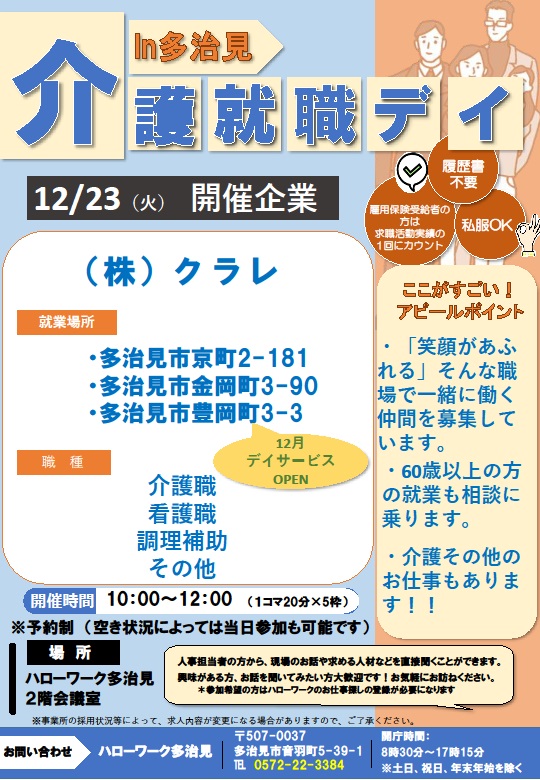 | 備 考 | ※予約制です。ハローワーク多治見の受付、またはお電話【TEL:0572-22-3384】にてご予約ください。 ※雇用保険受給者の方は求職活動実績となります。 |