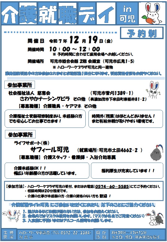 介護関係の事業所担当者と直接お話ができる介護就職デイ in 可児を開催しています。(事前予約制)