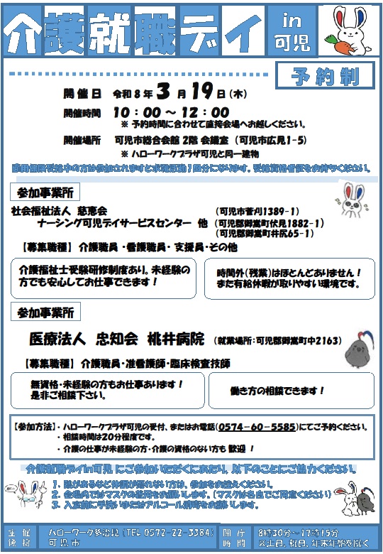 | 備 考 | ※予約制です。ハローワークプラザ可児の受付、またはお電話【TEL:0574-60-5585】にてご予約ください。 ※雇用保険受給者の方は求職活動実績となります。 主催:ハローワーク多治見 後援:可児市 |