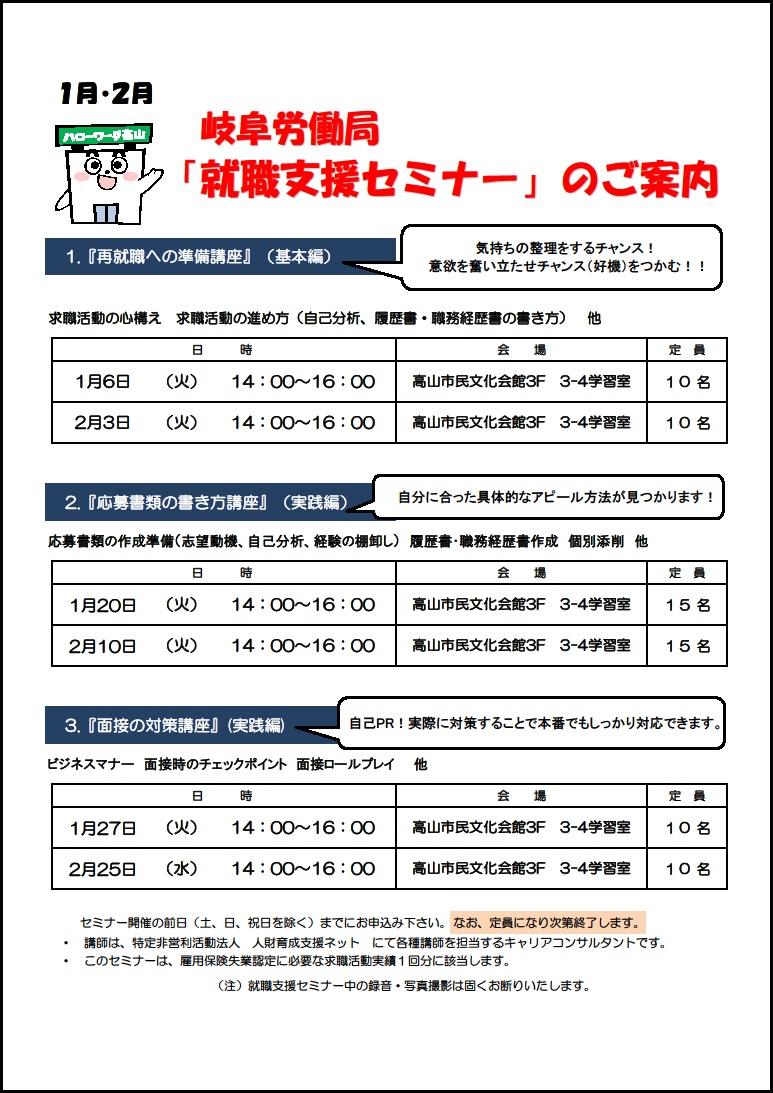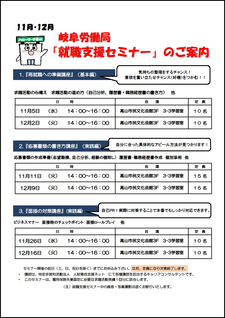 このセミナーは岐阜労働局(ハローワーク)が委託して実施する再就職のための支援セミナーです。履歴書・職務経歴書の作成のポイントや面接対策などを、セミナーにてわかりやすく説明します。