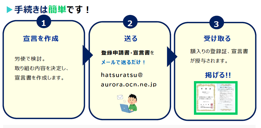 「公益社団法人岐阜県労働基準協会連合会」あてメールにて登録申請、宣言書をお送りください。
