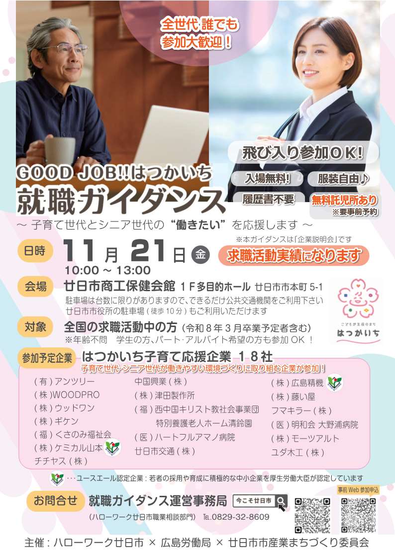 全世代誰でも参加大歓迎! 子育て世代・シニア世代が働きやすい環境づくりに取り組む企業が参加会社担当者と直接お話ができるチャンスです! 雇用保険の求職活動実績になります。 ※リーフレットをクリックすると拡大されます。