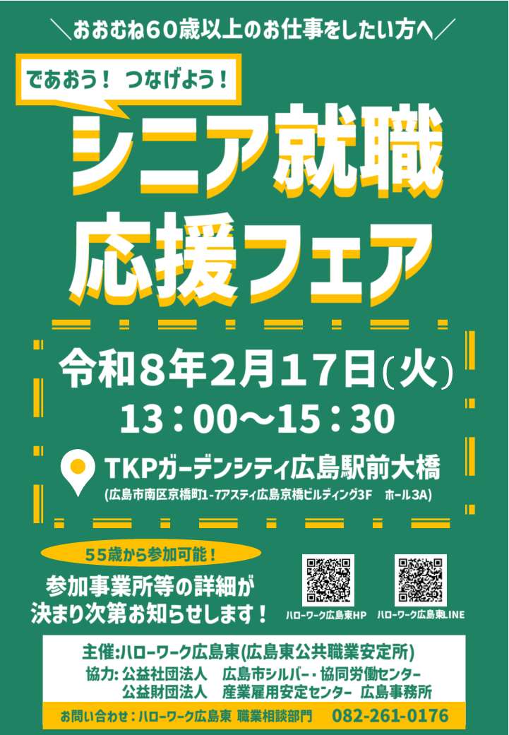 また、広島市シルバー⼈材センター及び産業雇⽤安定センターも個別ブースを出展。気になることは何でも相談してください。