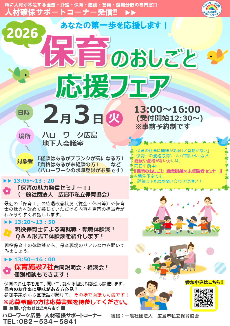 ハローワーク広島では、ブランクのある方や資格はあるが未経験の方などを対象とした『保育のおしごと応援フェア』(R8年2月3日(火))を開催します。 『保育施設合同説明会・相談会』では事業所の採用担当者と直接お話ができる機会です。