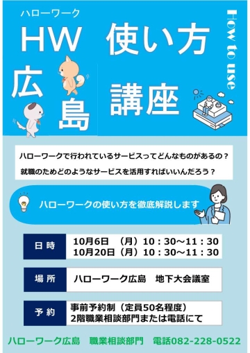 【ハローワーク使い方講座】 ハローワーク広島を効果的に利用していただくための 使い方を徹底解説します! |