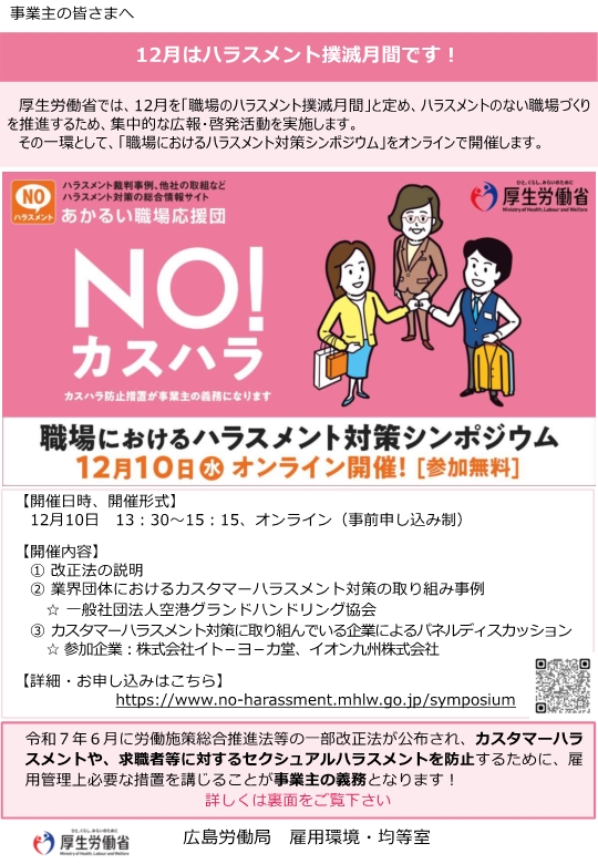 ■「職場におけるハラスメント対策シンポジウム」(12月10日(水)オンラインLIVE配信)を開催します。