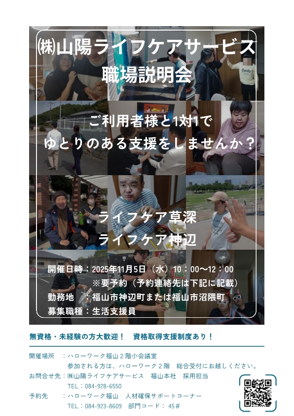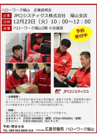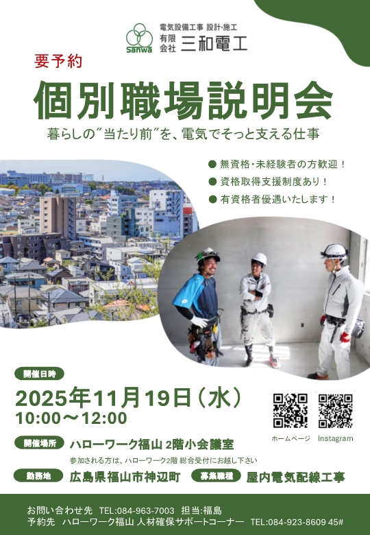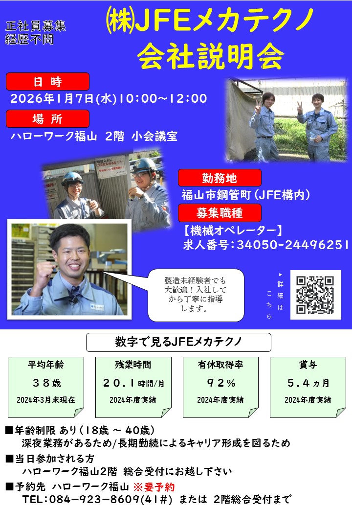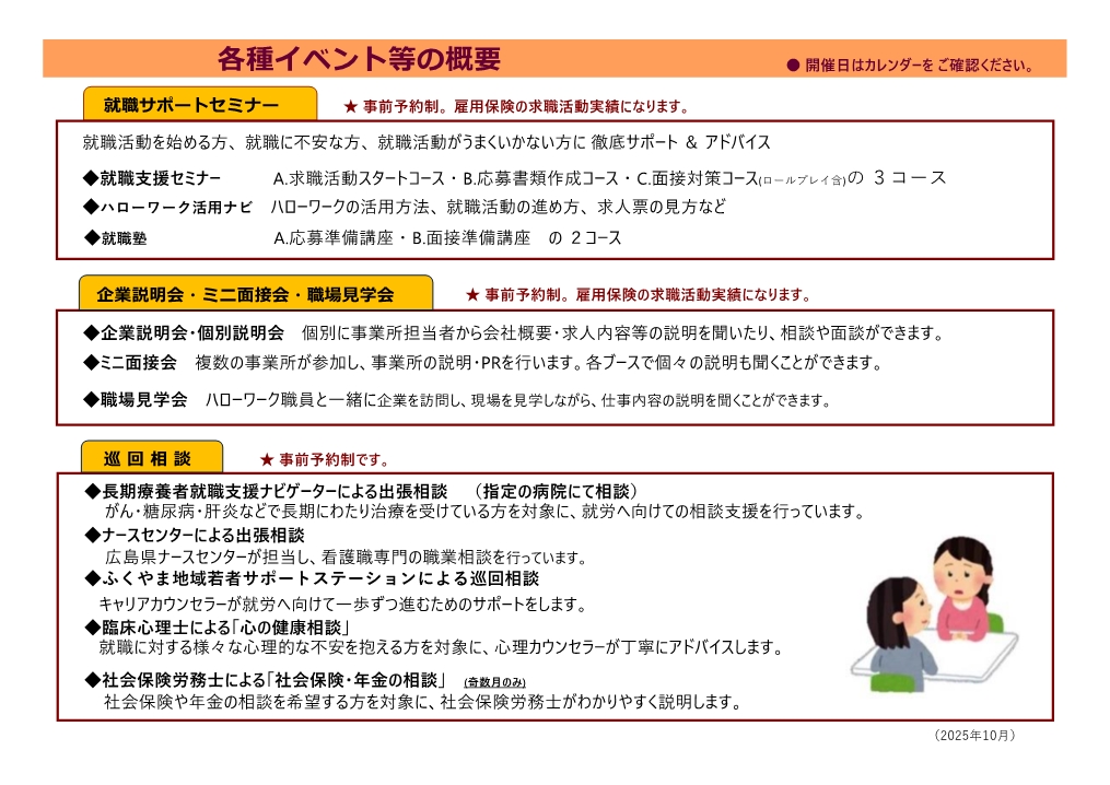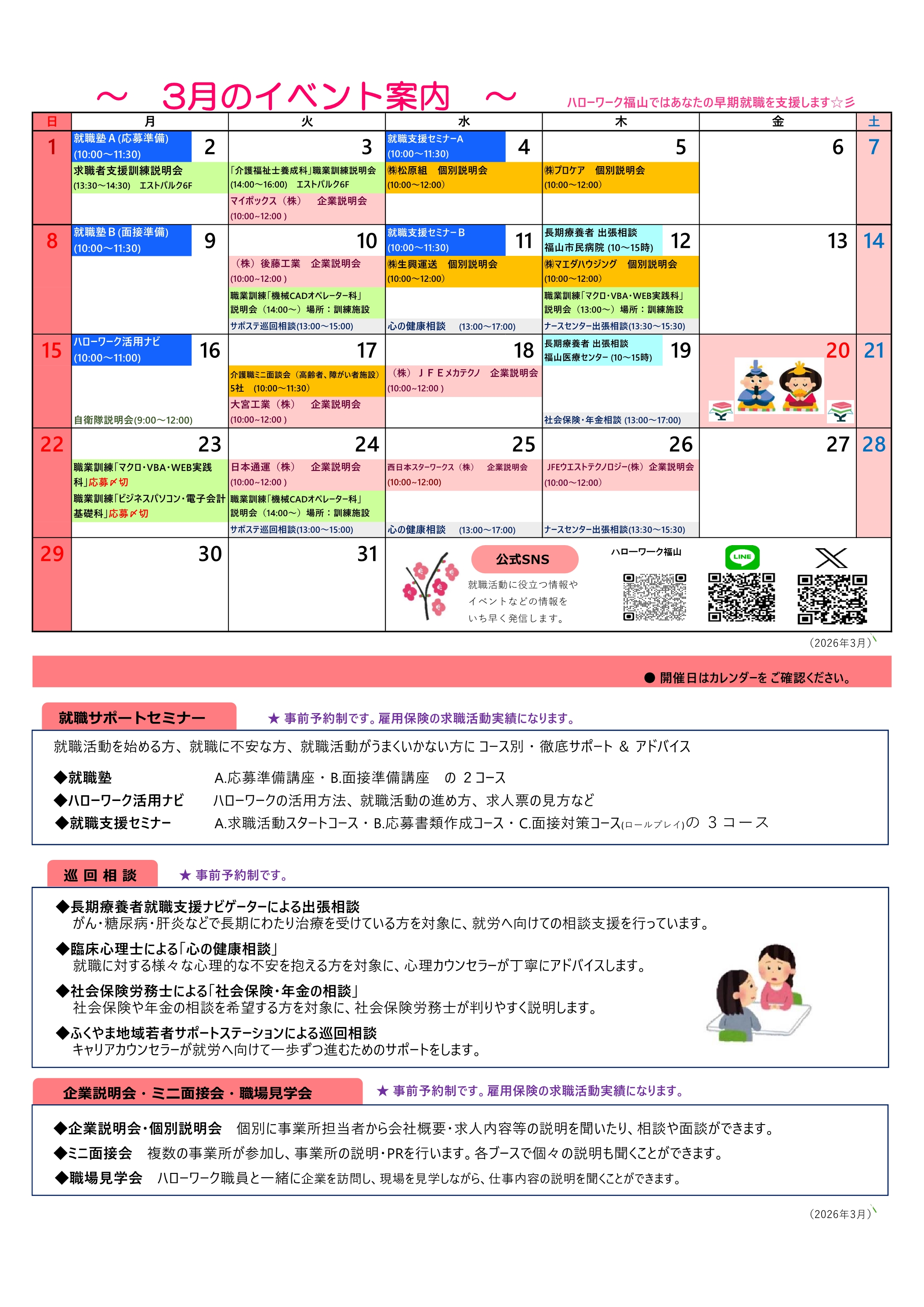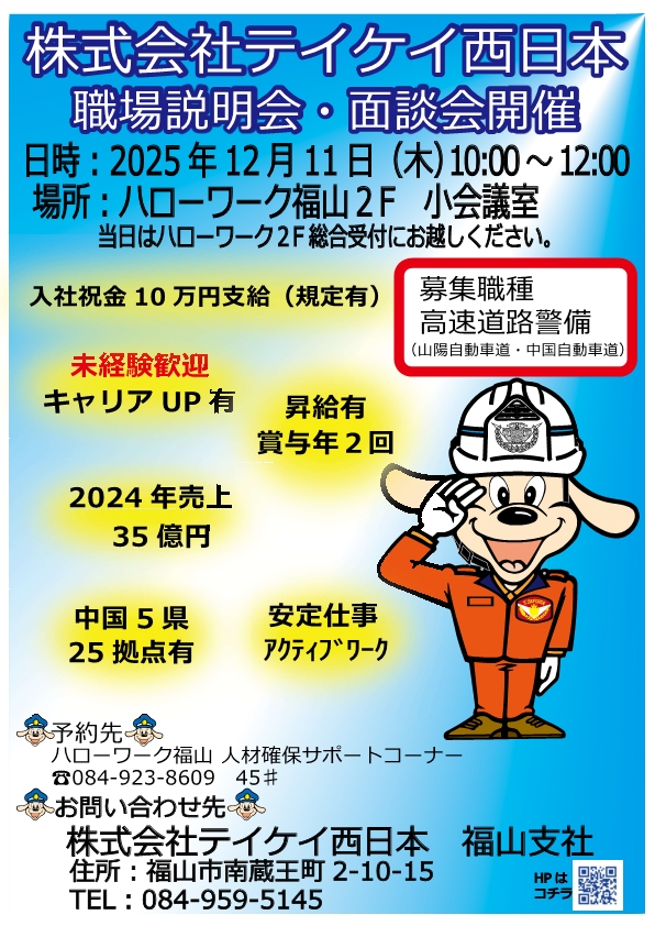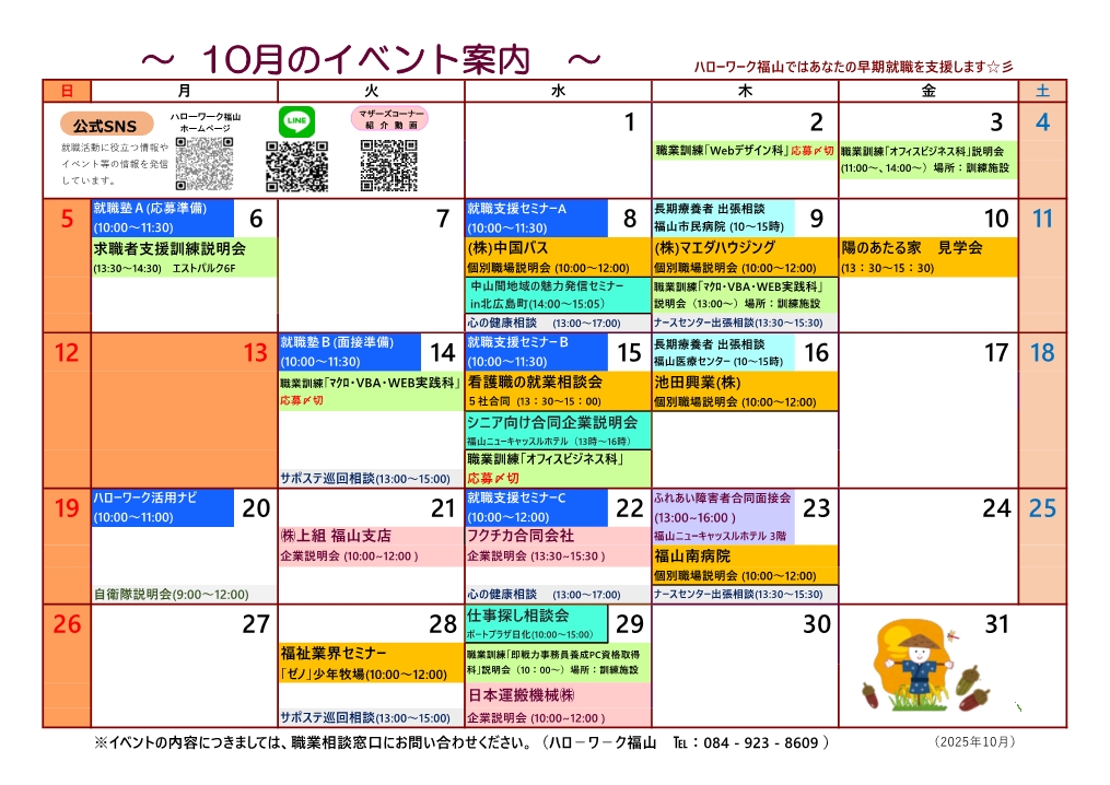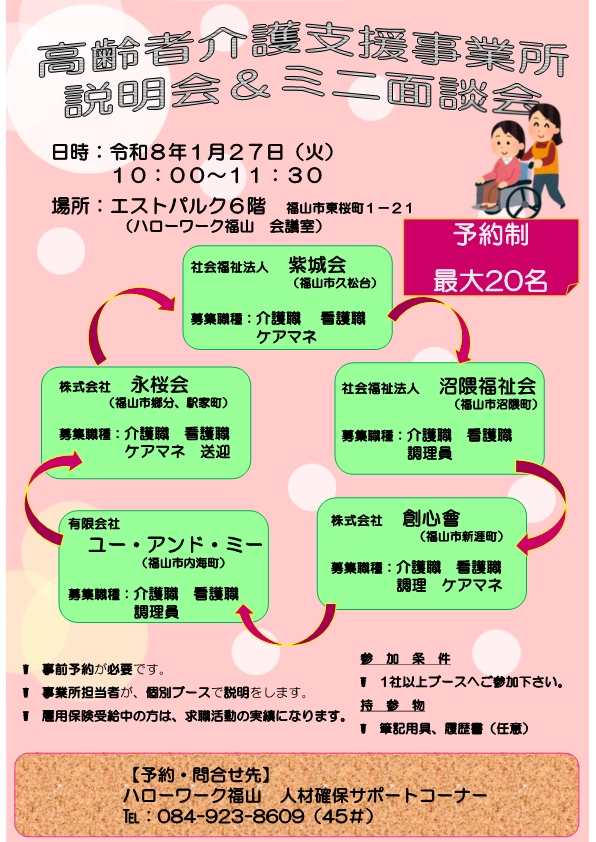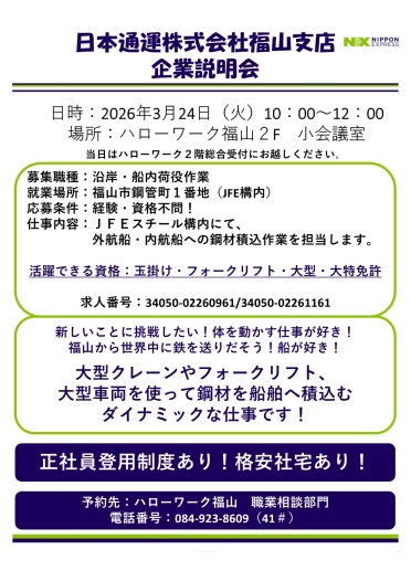 イベントについての質問やイベント開催を希望する事業所様は下記までご連絡ください。 【医療・福祉・介護・保育・建設・警備・運輸分野の事業所】 ハローワーク福山人材確保サポートコーナー 📞084-923-8609(45#) 【上記以外の分野の事業所】 ハローワーク福山事業所サービス部門 📞084-923-8609(31#)