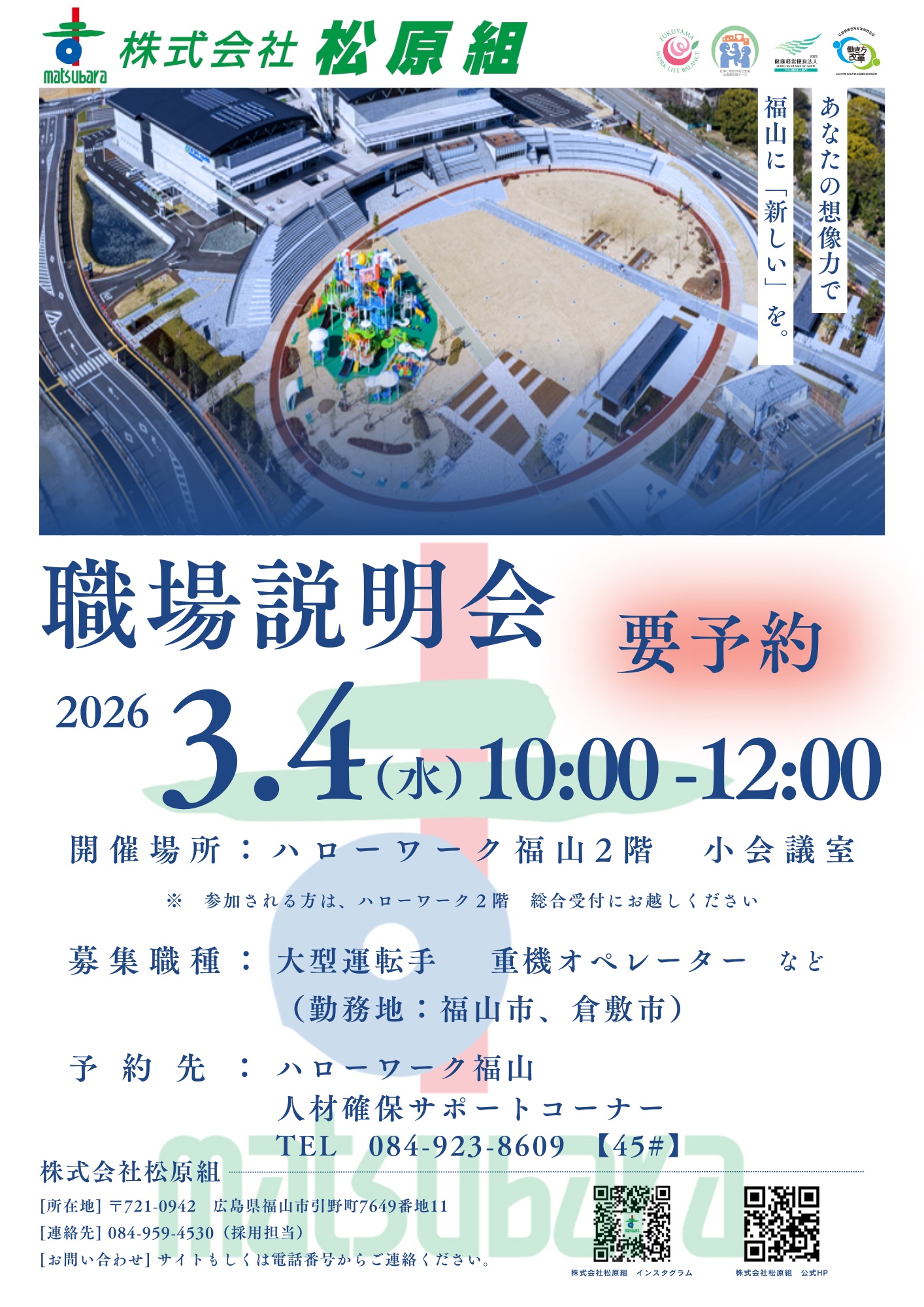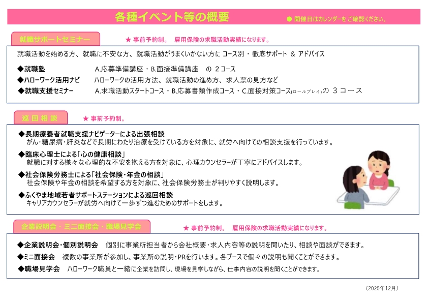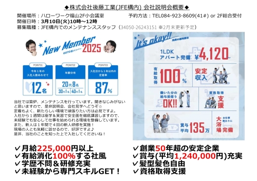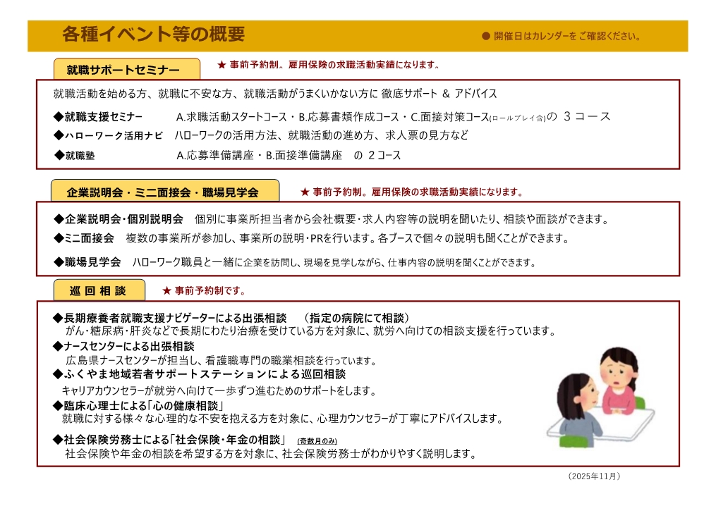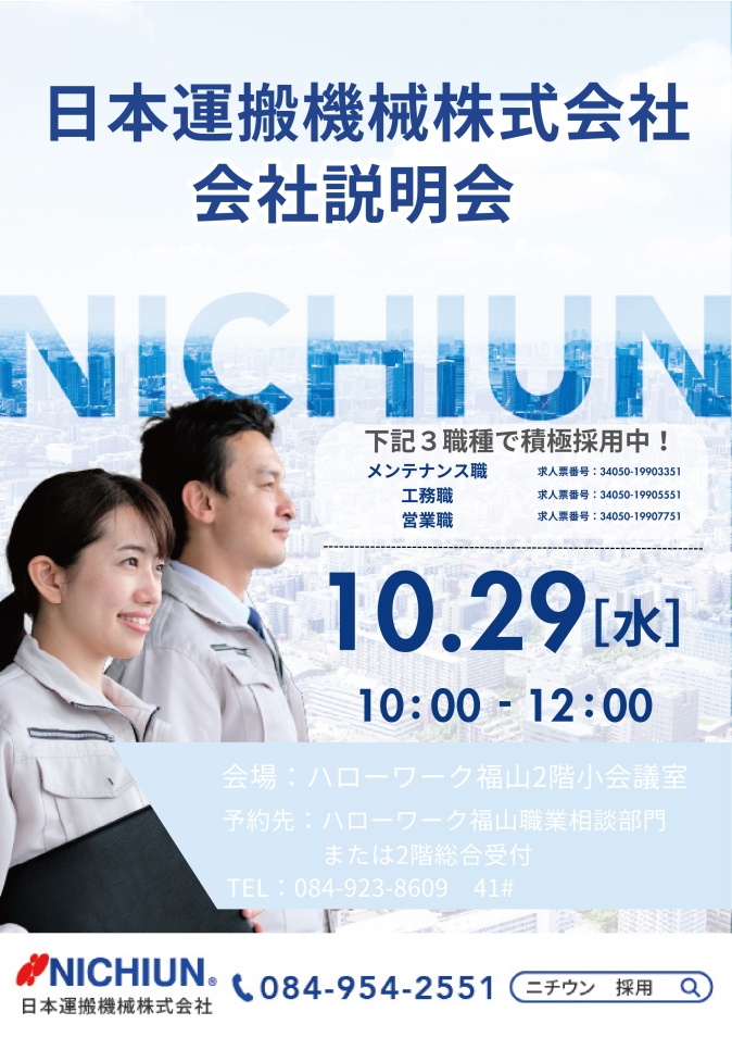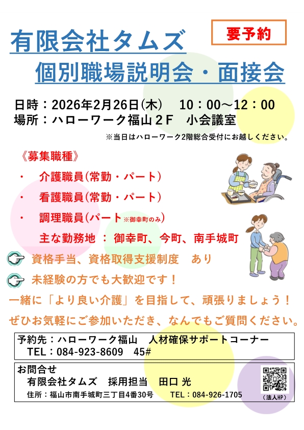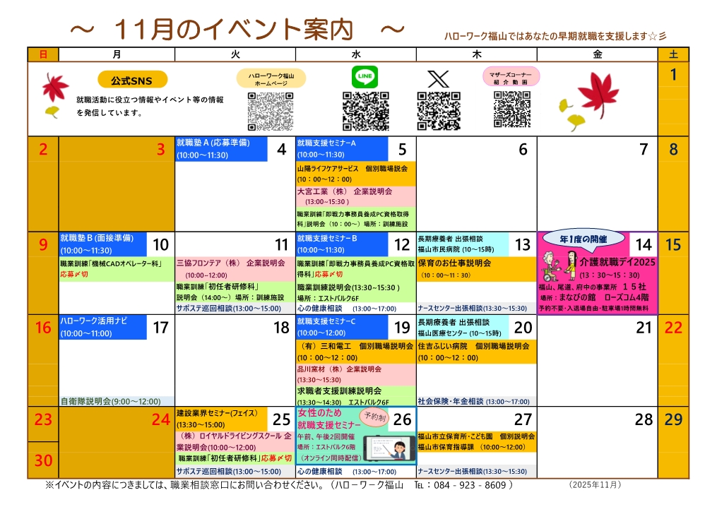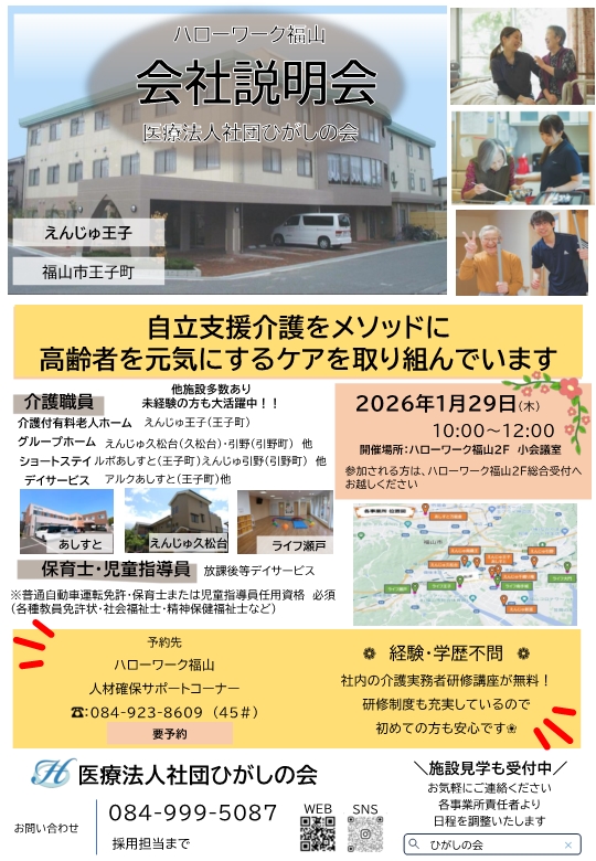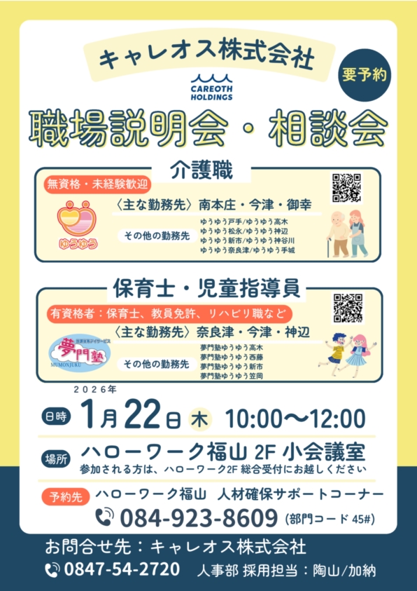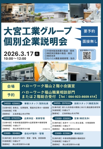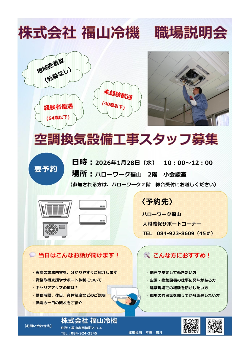 イベントについての質問やイベント開催を希望する事業所様は下記までご連絡ください。 【医療・福祉・介護・保育・建設・警備・運輸分野の事業所】 ハローワーク福山人材確保サポートコーナー 📞084-923-8609(45#) 【上記以外の分野の事業所】 ハローワーク福山事業所サービス部門 📞084-923-8609(31#)