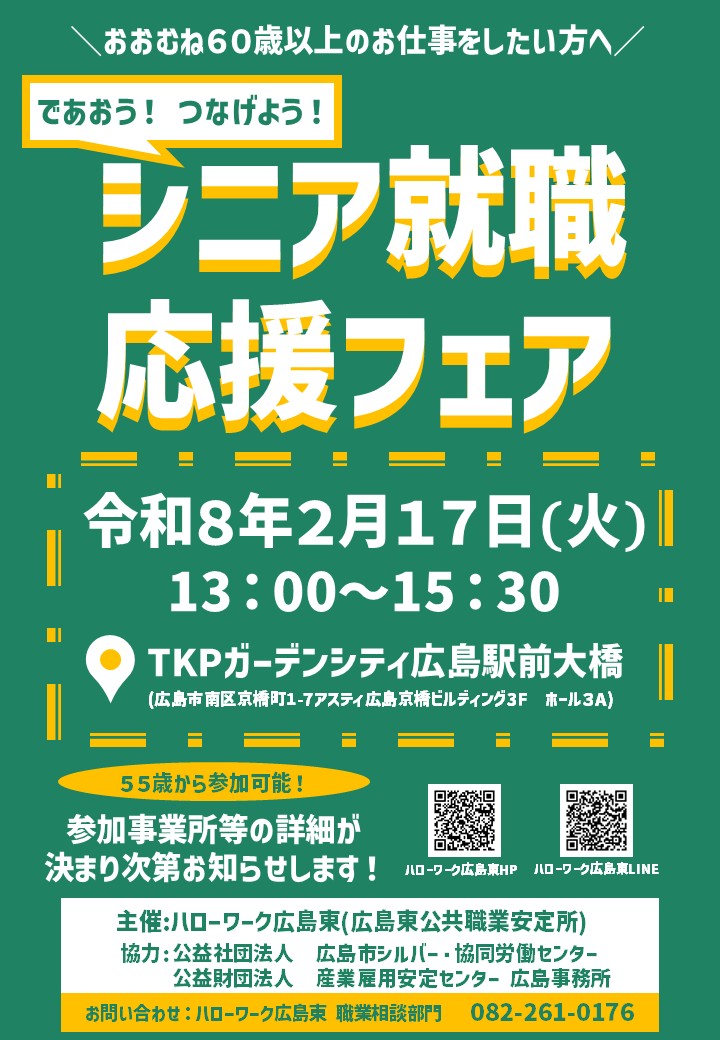 また、広島市シルバー人材センター及び産業雇用安定センターも個別ブースを出展。気になることは何でも相談してください。