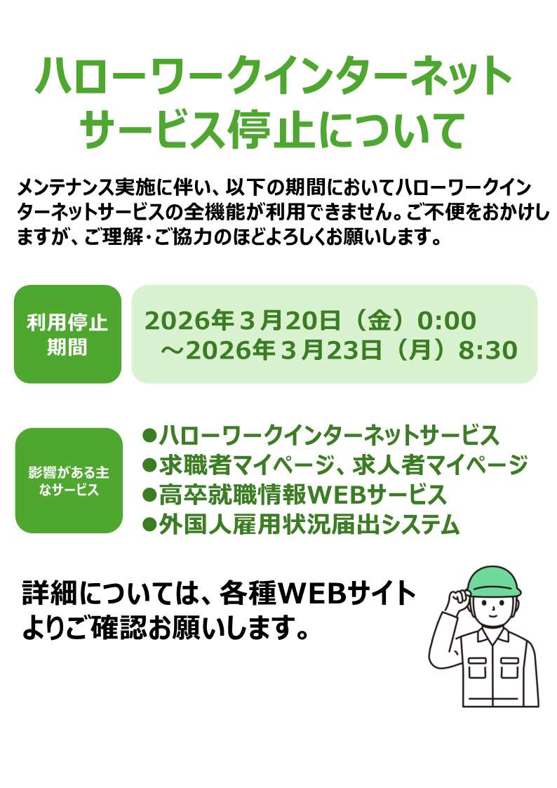 メンテナンス実施に伴い、以下の期間において、ハローワークインターネットサービスの全機能をご利⽤いただけません。