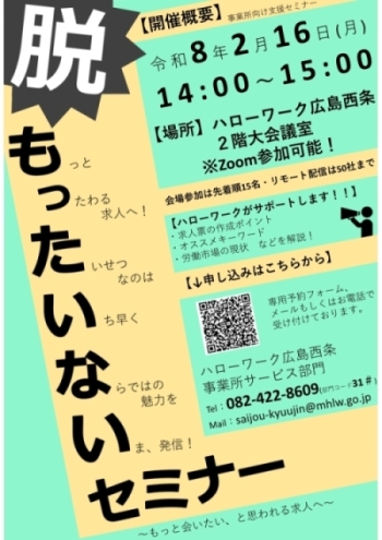 ハローワーク広島西条 求人窓口(082-422-8609 31#)までお願いいたします。