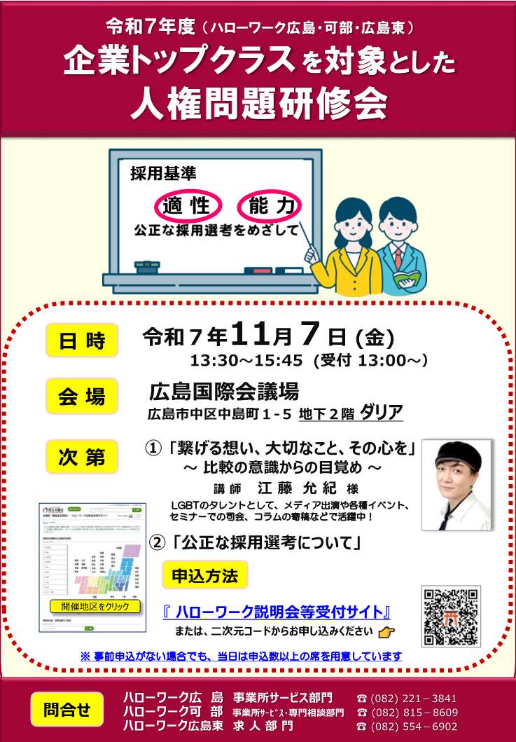 *企業で人事・労務に携わる方を対象として、公正な採用選考システムや人権問題等に関する正しい理解と認識を深めていただくための研修です。 *当日は、LGBT タレントとして広島でご活躍の 江藤 允紀 様から、「これまで」及び「こ れから」について、「多様性」「アイデンティティの確立」、個人の尊厳にかかわる問題等 についてご講演いただきます。