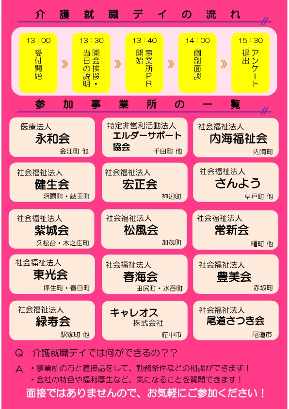 福山・府中・尾道管内に就業場所がある介護職を営む事業所が15社参加され、各事業所の1分間PRタイムの後、個別ブースで個々に面談・相談ができます。 |