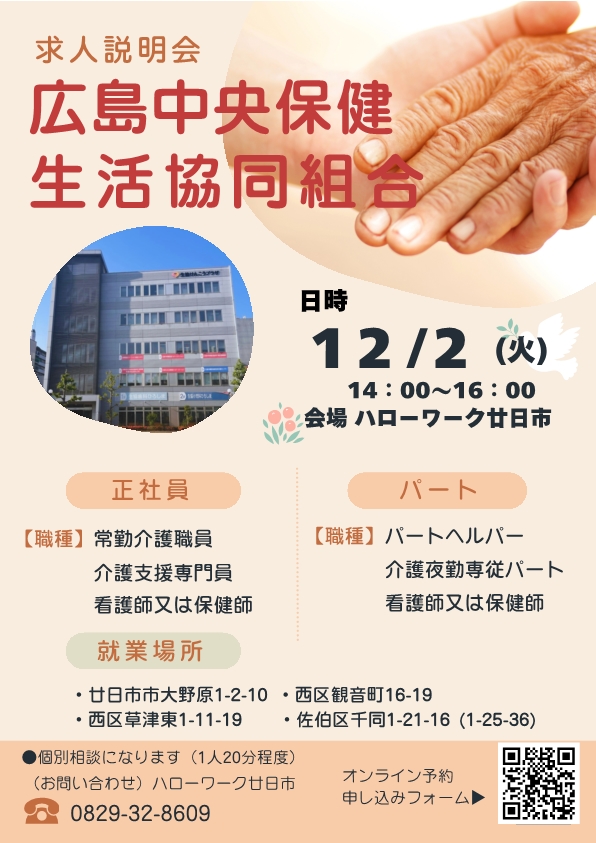 | 【求人説明会】広島第一交通 株式会社 | 【求人説明会】医療法人 みやうち | 【求人説明会】広島中央保健生活協同組合 |