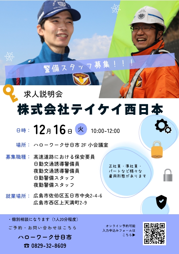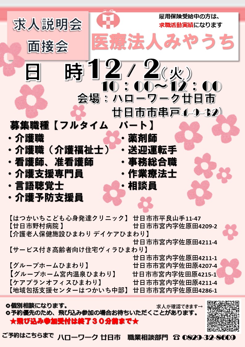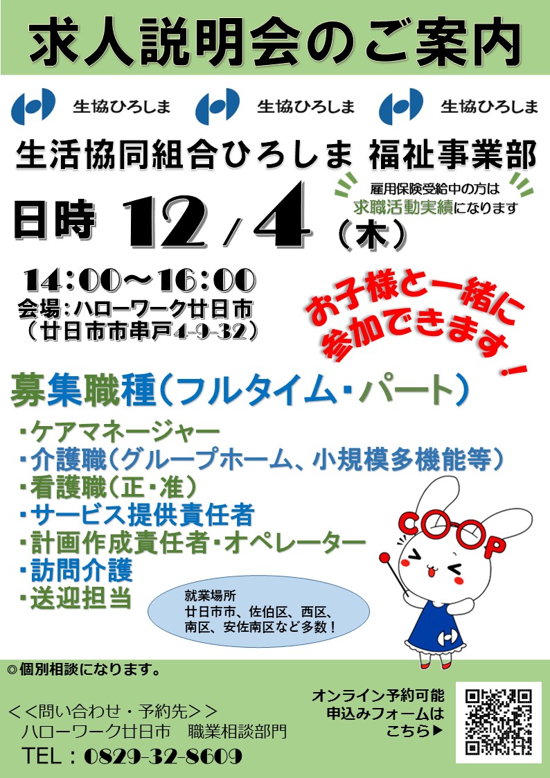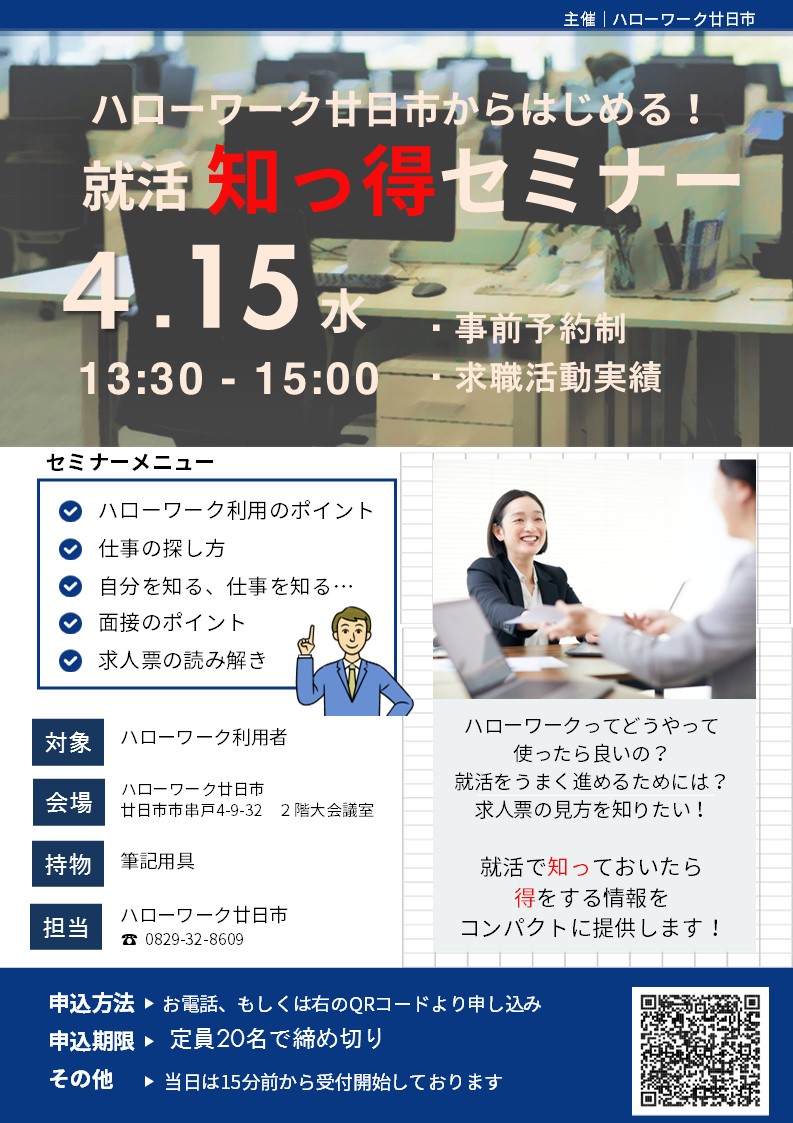 求人説明会・セミナーのご予約はこちら▶0829-32-8609(ハローワーク廿日市 職業相談部門)