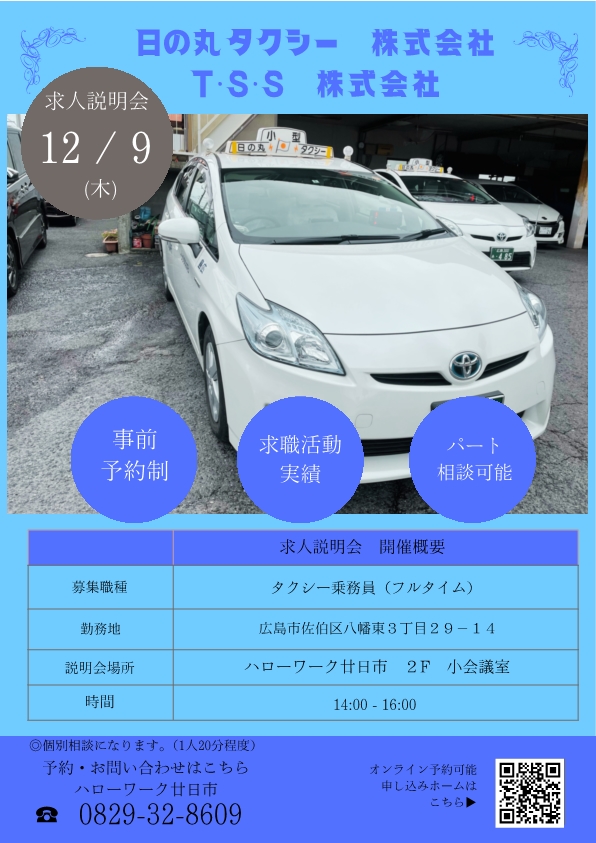 | 【求人説明会】生活協同組合ひろしま | マザーズセミナー | 【求人説明会】日の丸タクシー株式会社/T・S・S株式会社 |