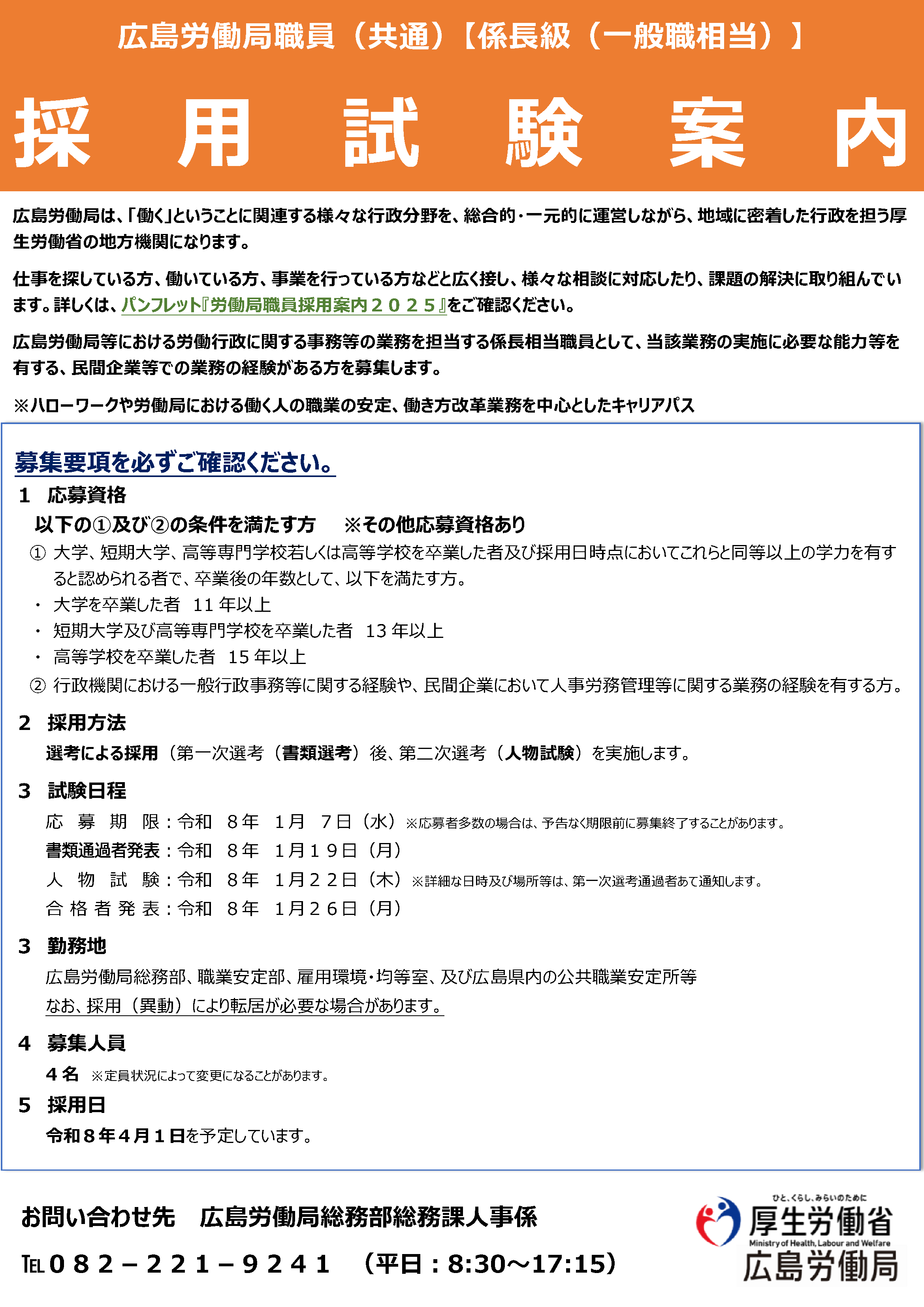 広島労働局 総務部総務課 人事係(TEL 082-221-9241)