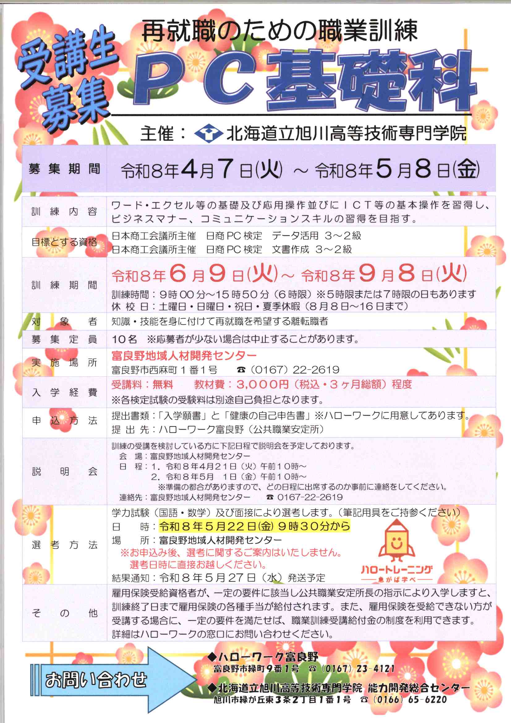 お手続きについては、ハローワーク富良野までお問い合わせください。