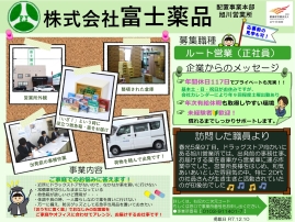 | R7.12.10 | (株)富士薬品 旭川営業所 業種:医薬品・化粧品小売業 「おうちに置く薬」でおなじみの配置薬をご家庭やオフィスに合わせてアレンジ、お届けするお仕事です! 年間休日117日でプライベートも充実!! 年次有給休暇も取得しやすい環境 未経験者歓迎! |