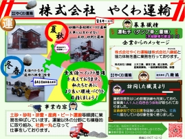 | R7.12.12 | (株)やくわ運輸 業種:一般貨物自動車運送業 土砂・砂利・排雪・産廃・ビート運搬等順調に業務を伸ばしています。運搬以外の分野にも積極的に取り組み、社員一丸となって仕事をしております。 |