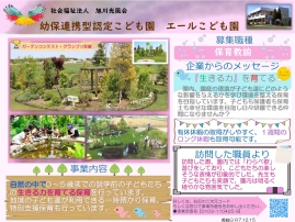 | R7.12.15 | (社福)旭川光風会 幼保連携認定こども園 エールこども園 業種:児童福祉事業 自然の中で0~5歳までの就学前の子どもたちの生きる力を育てる保育を行っています。地域の子ども達が利用できる一時預かり保育、特別支援保育も行っています。 |
