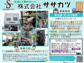 | R7.12.16 | (株)ササカツ 業種:建築材料卸売業 \\配管資材の販売・卸売を行っている会社です// 配管の材料でも特にエアコン資材の販売については、旭川地区の代理店であります。各メーカーのバックアップにより常に売上げをあげています! ☆30代~60代のスタッフが活躍中☆ |