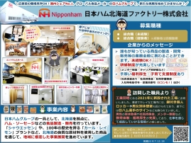 | R7.12.19 | 日本ハム北海道ファクトリー(株) 業種:畜産食料品製造業 日本ハムグループの一員として、北海道を拠点に、ハム・ソーセージなどの食品製造・販売を行っています。 「シャウエッセン」や、100年の歴史を誇る「カール・レイモン」ブランドなど、北海道の良質な原材料を使用した商品を通じて、地域に根差した事業展開を進めています。 |