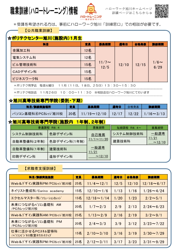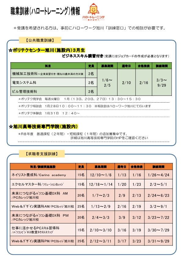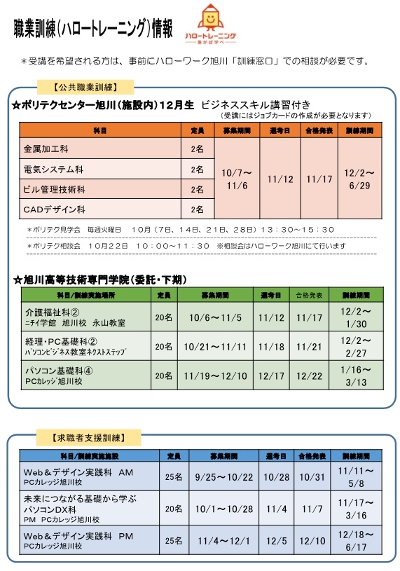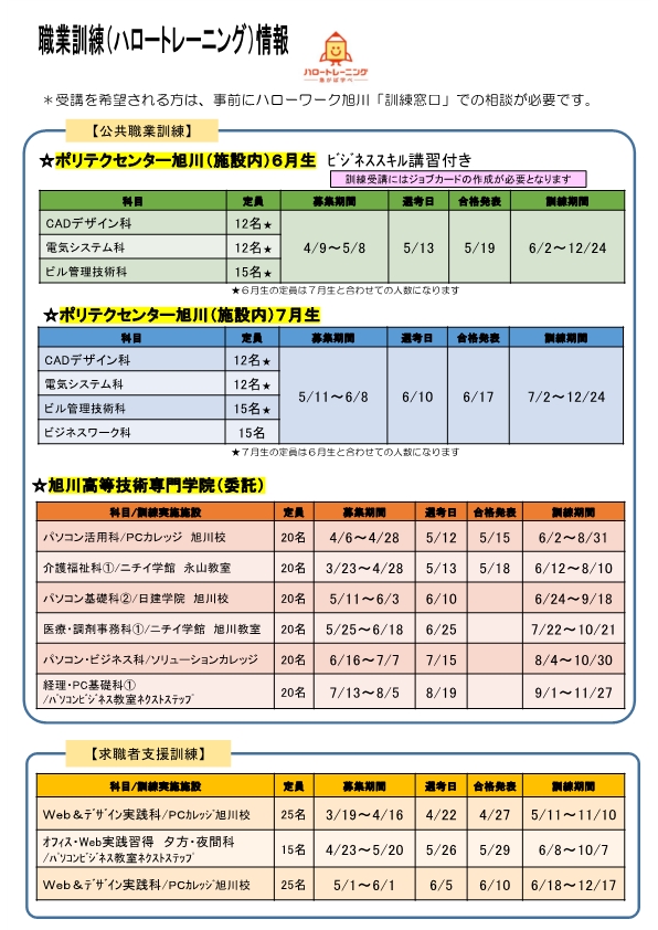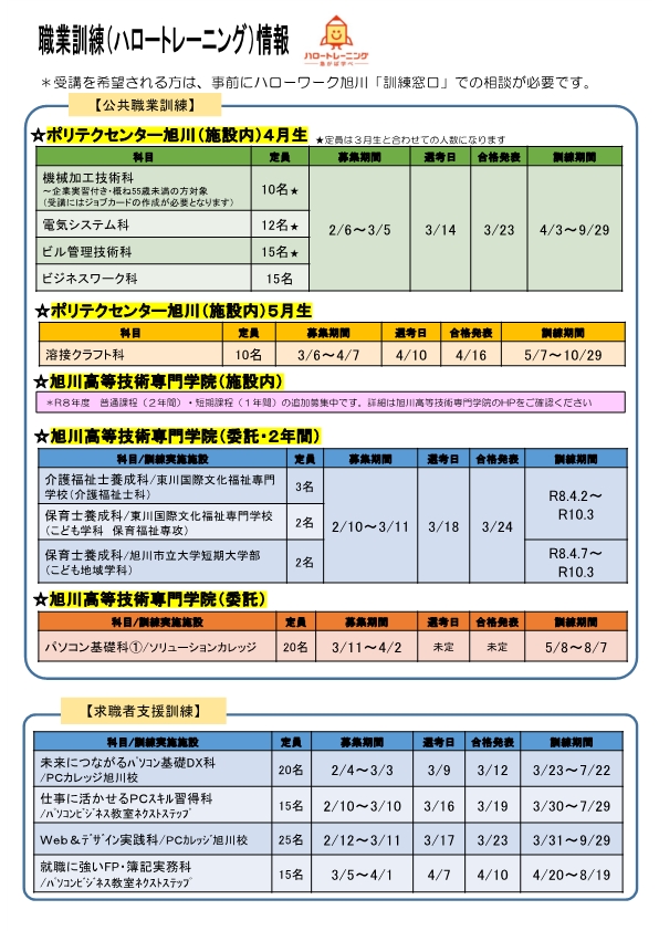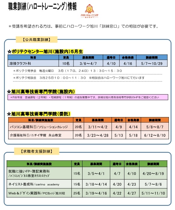 - 応募方法:各科、コースの募集期間内にハローワーク旭川で配布する申込書を職業訓練窓口へ提出してください。