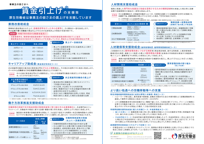 生産性向上(設備・人への投資等)や、非正規雇用労働者の処遇改善等を通じ、労働市場全体の「賃上げ」を支援しています