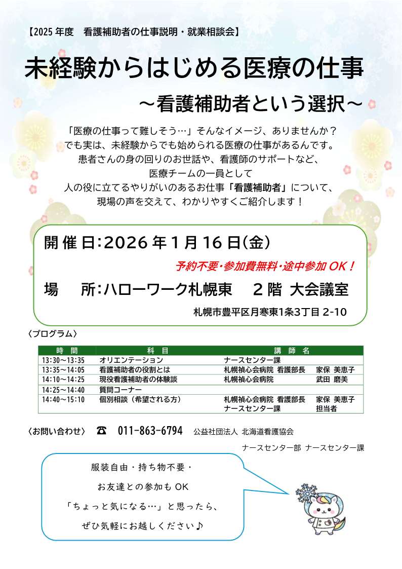 1/16開催 「未経験からはじめる医療の仕事~看護補助者という選択~」のご案内