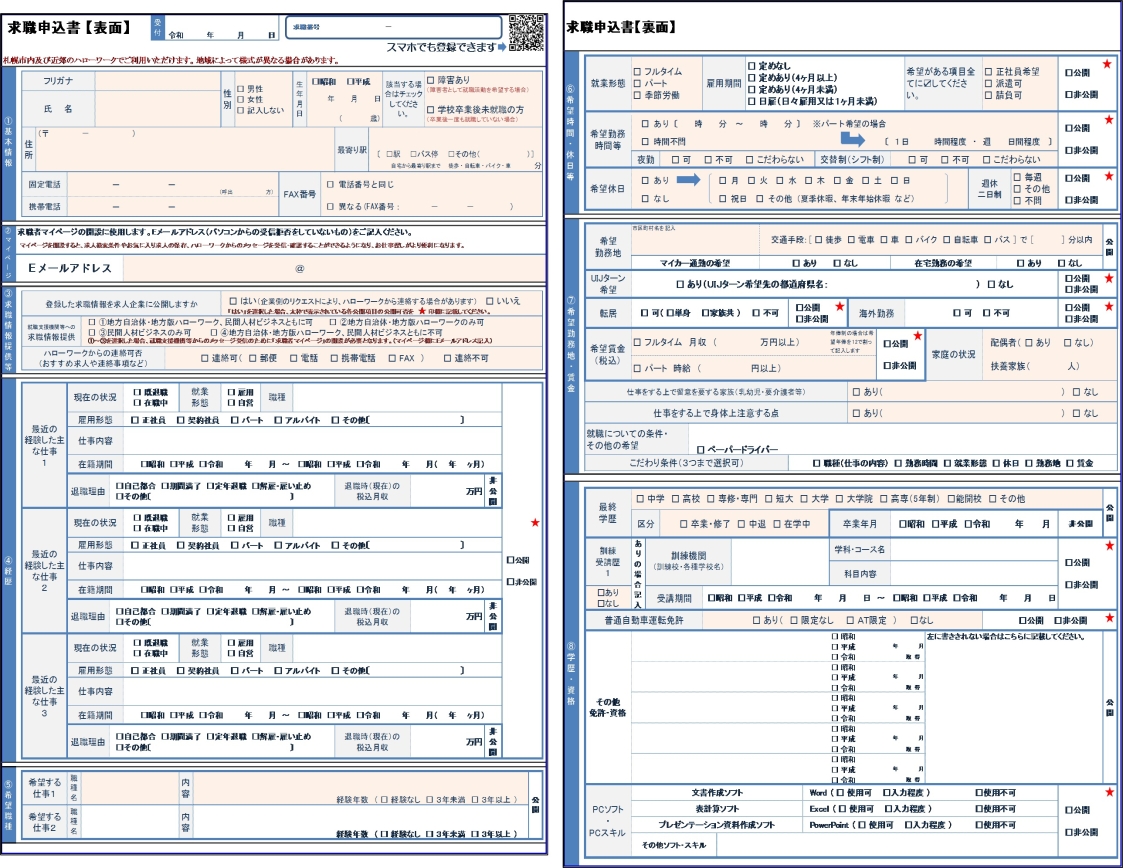 オンラインで求職登録できない方は、「求職申込書」の必要事項を記載いただき、職業相談窓口に持参ください。なお、ハローワークの総合受付でも「求職申込書」を配布しておりますし、職業相談窓口でスタッフと相談しながら作成・登録することも可能です。