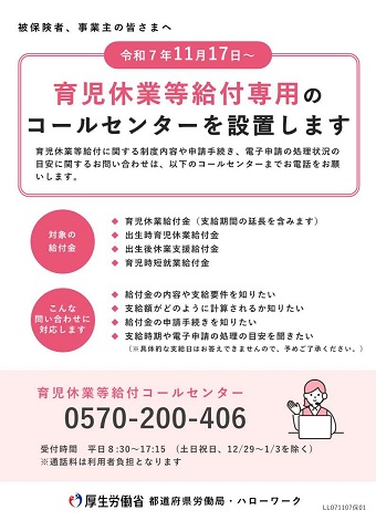 育児休業等給付のお問い合わせコールセンターの設置について