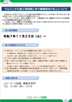 ハローワーク函館では、会社と連携の上、工場閉鎖に伴い離職を予定されている従業員の方の再就職支援を進めております。