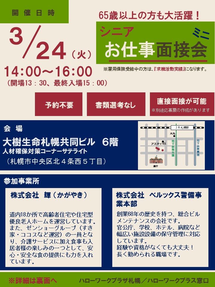 シニアお仕事面接会を開催します!【ハローワークプラザ札幌・ハローワークプラス窓口】