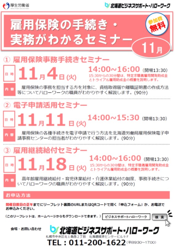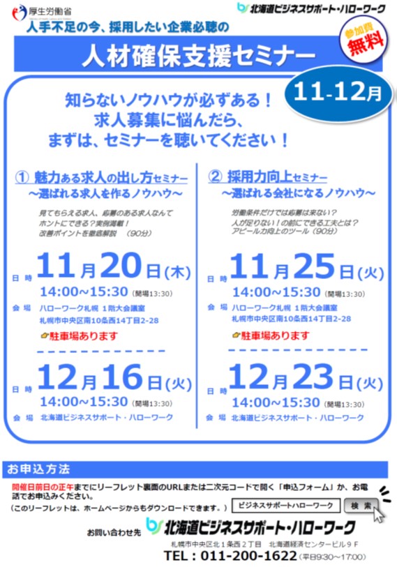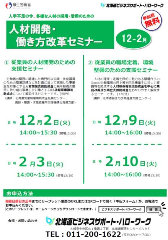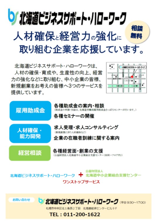 北海道ビジネスサポート・ハローワークは、主に札幌圏(札幌市内・近郊)の中小企業の皆様、新規に創業をお考えの皆様を対象に、人材の確保・育成、生産性の向上、経営力の強化などの課題に関して、各種雇用助成金の案内・相談、人材確保、経営相談等のサービスをワンストップで提供しています。