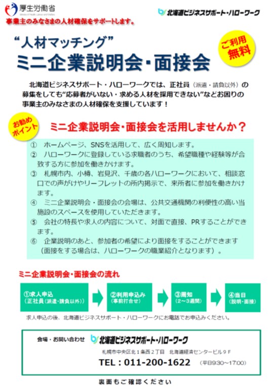 正社員の募集を行っても応募者がいない、求める人材を採用できないなど人材確保でお困りの事業主の皆様、ミニ企業説明会・面接会に参加してみませんか。