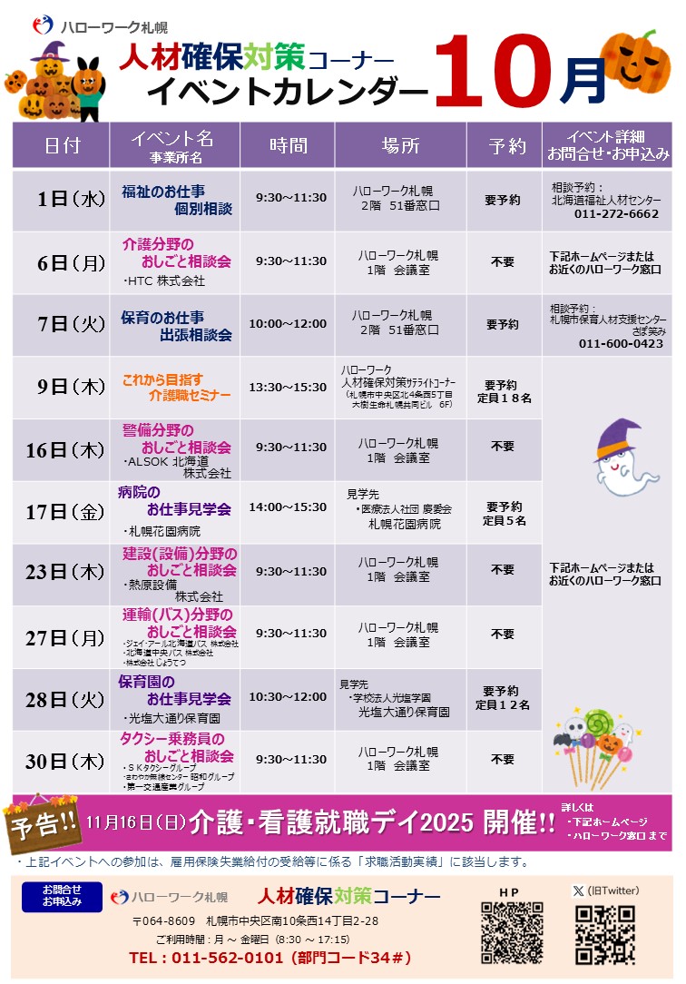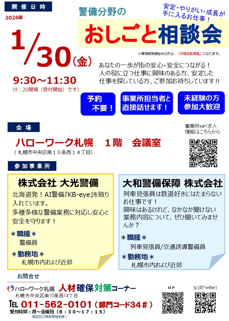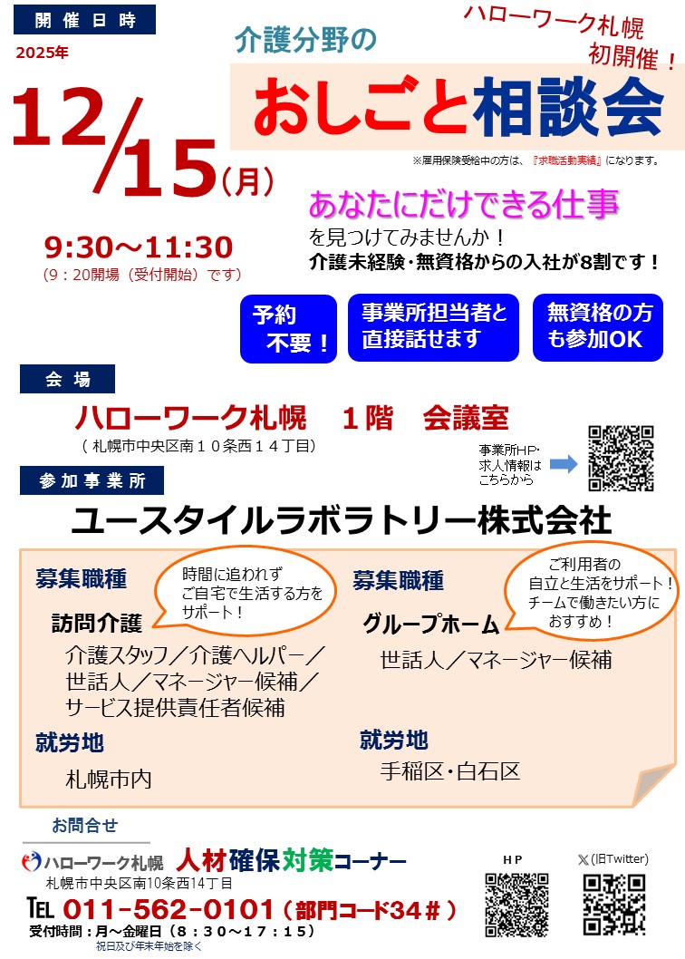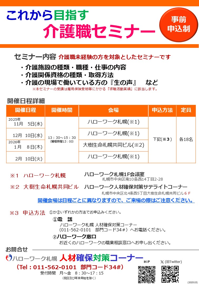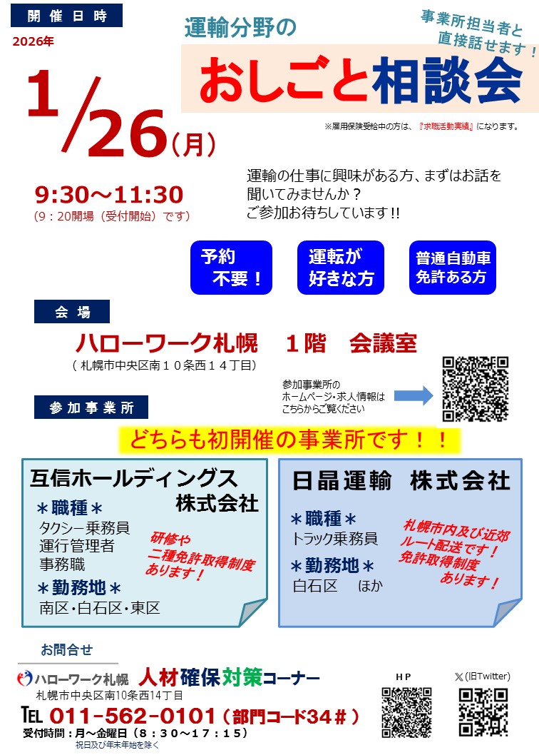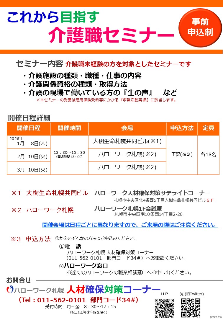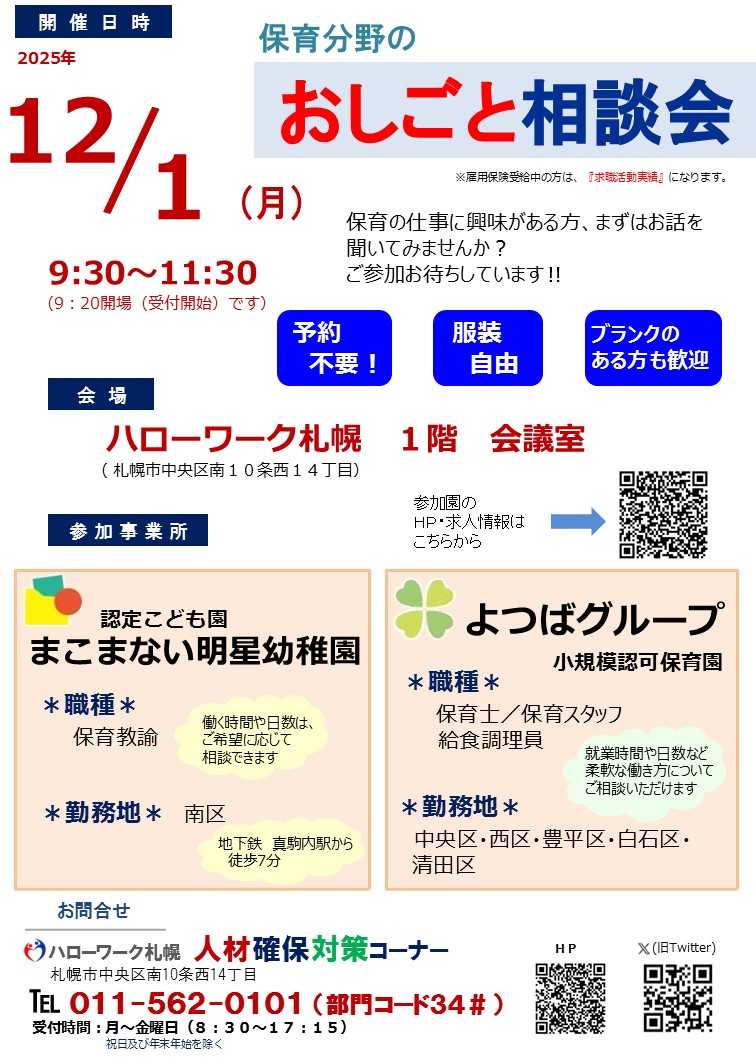 ハローワーク札幌 人材確保対策コーナー(011-562-0101/部門コード34#)へお電話ください。