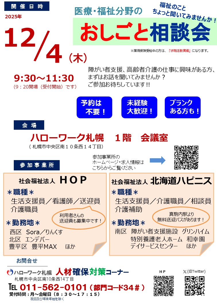 12/3(水)福祉のお仕事個別相談(北海道福祉人材センター主催)