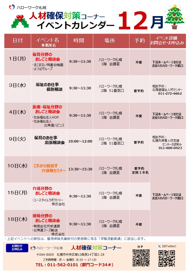 12月 10日(水) 会場集合 ハローワーク札幌(※1)