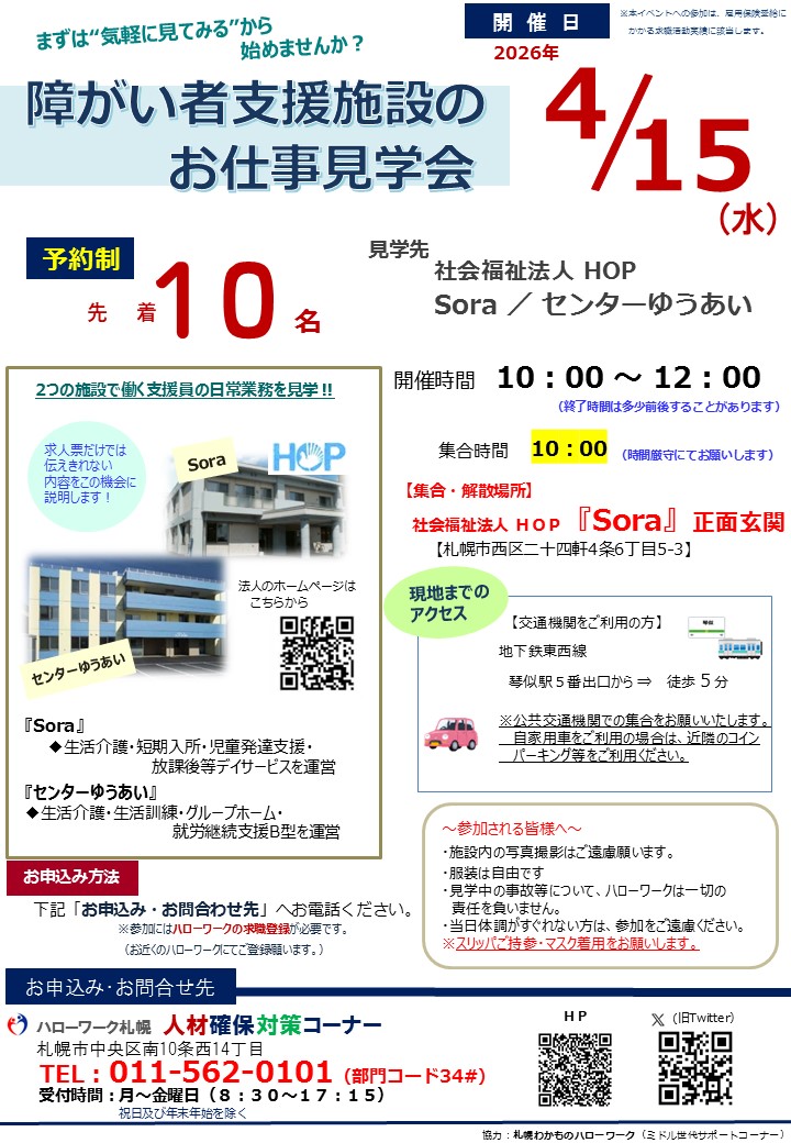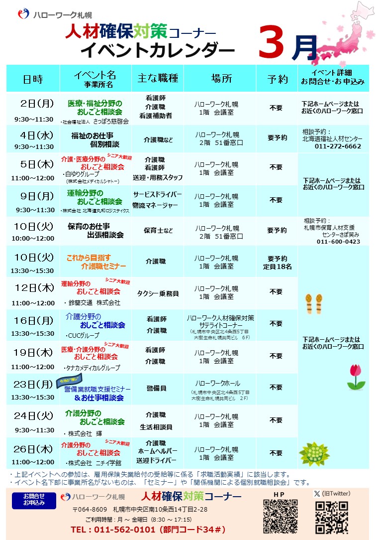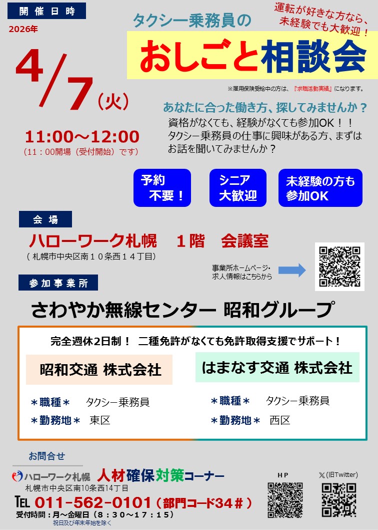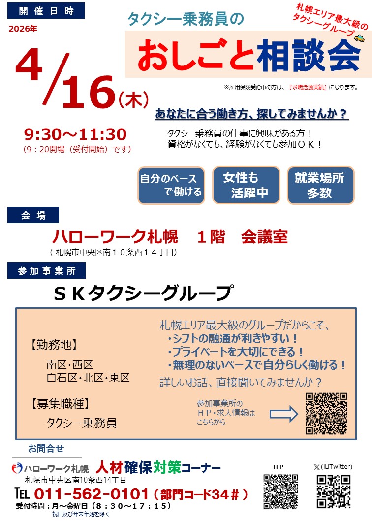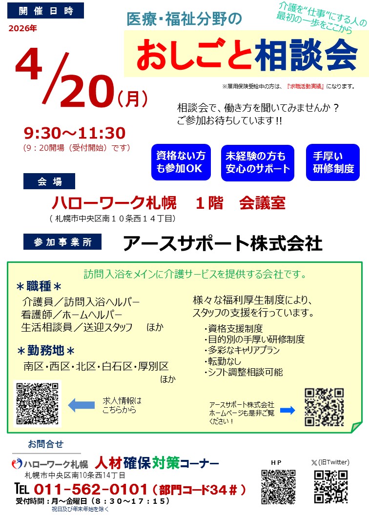 ハローワーク札幌 人材確保対策コーナー( 011-562-0101/部門コード34#)へお電話ください。
