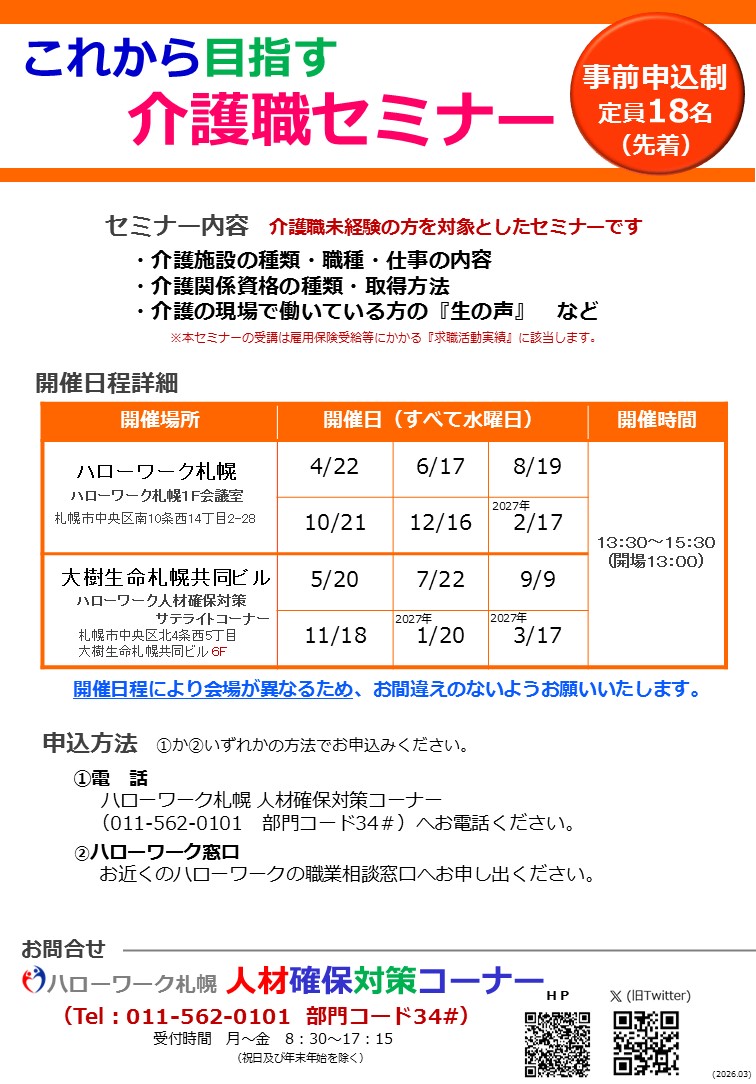 2026年 4月22日(水) ハローワーク札幌(※1) 5月20日(水) 大樹生命札幌共同ビル(※2) 6月17日(水) ハローワーク札幌(※1) 7月22日(水) 大樹生命札幌共同ビル(※2) 8月19日(水) ハローワーク札幌(※1) 9月 9日(水) 大樹生命札幌共同ビル(※2) 10月21日(水) ハローワーク札幌(※1) 11月18日(水) 大樹生命札幌共同ビル(※2) 12月16日(水) ハローワーク札幌(※1) 2027年 1月20日(水) 大樹生命札幌共同ビル(※2) 2月17日(水) ハローワーク札幌(※1) 3月17日(水) 大樹生命札幌共同ビル(※2)