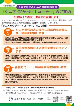 ハローワーク札幌では、「シニアJOBサポートコーナー」を設け、再就職などを目指す概ね60歳以上の方を対象に、各種サービスを行っています。(65歳以上の方を重点的に支援します!)