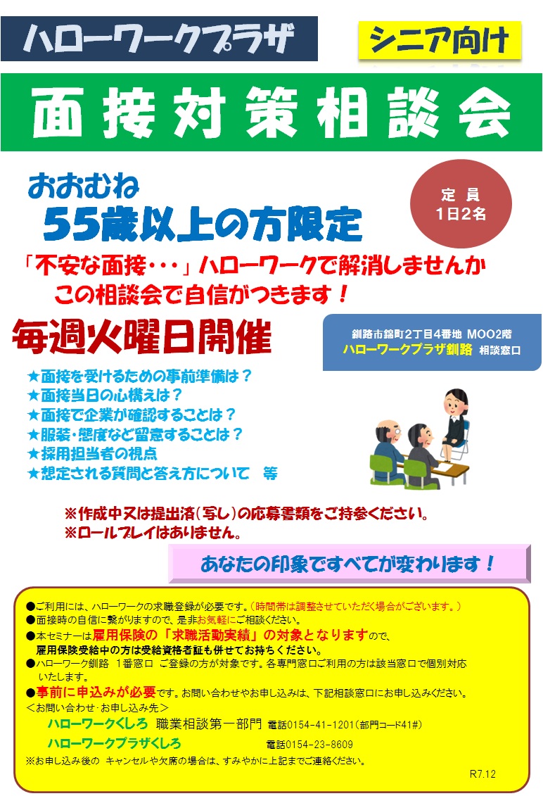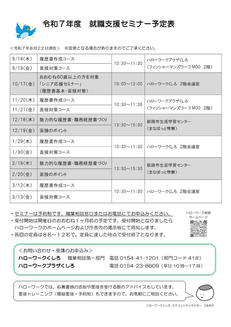 セミナーを受講されたい方はハローワーク釧路職業相談第1部門までご連絡ください。