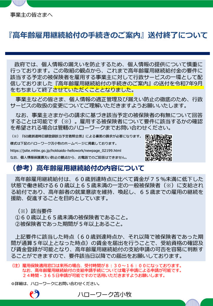 令和7年9月をもちまして、『高年齢雇用継続給付の手続きのご案内』の送付を終了させていただくこととなりました。