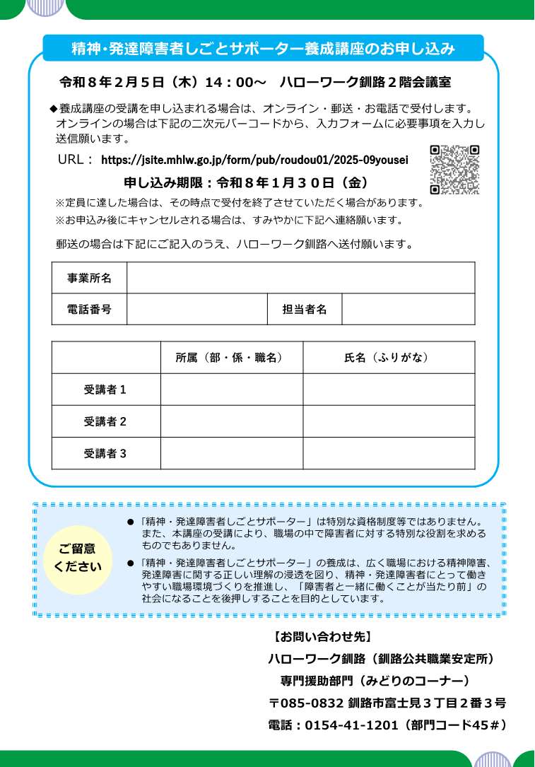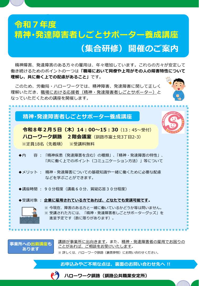 このため、労働局・ハローワークでは、精神障害、発達障害に関して正しく理解いただき、「職場における応援者(精神・発達障害者しごとサポーター)」となっていただくための講座を開催します。