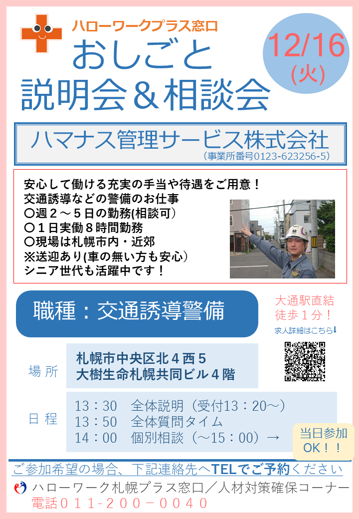 12月16日(火)に「おしごと説明会&相談会」を開催します(ハマナス管理サービス(株)交通誘導警備)。