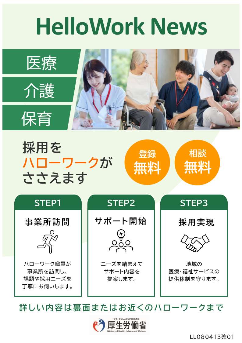 医療・介護・保育分野の人材確保を支援する「医療・福祉ささえる求人充足プロジェクト」を実施中です。地域の医療・介護・保育サービス提供体制の維持・充実に向け、ハローワークが事業所訪問や求人票改善、応募勧奨、面接会開催に加え求職者の方へ積極的な情報提供などを通じ、採用活動をサポートします。