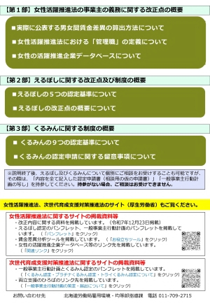 本説明会では、女性活躍推進法改正における新たな取組義務、一部改正されるえるぼしの認定基準に加え、当課所掌の次世代法の認定制度くるみんの説明をします。