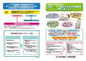仕事と介護を両立するための制度(介護休業、介護休暇、残業免除制度等)がいろいろあります。介護離職を考える前に、下記リーフレットに記載されている「仕事をしながら利用できる制度」を活用しましょう。