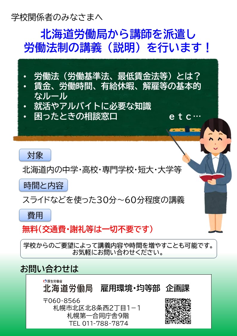 北海道労働局では、各学校からのご要望により「出前講座(労働法セミナー)」を実施しております。